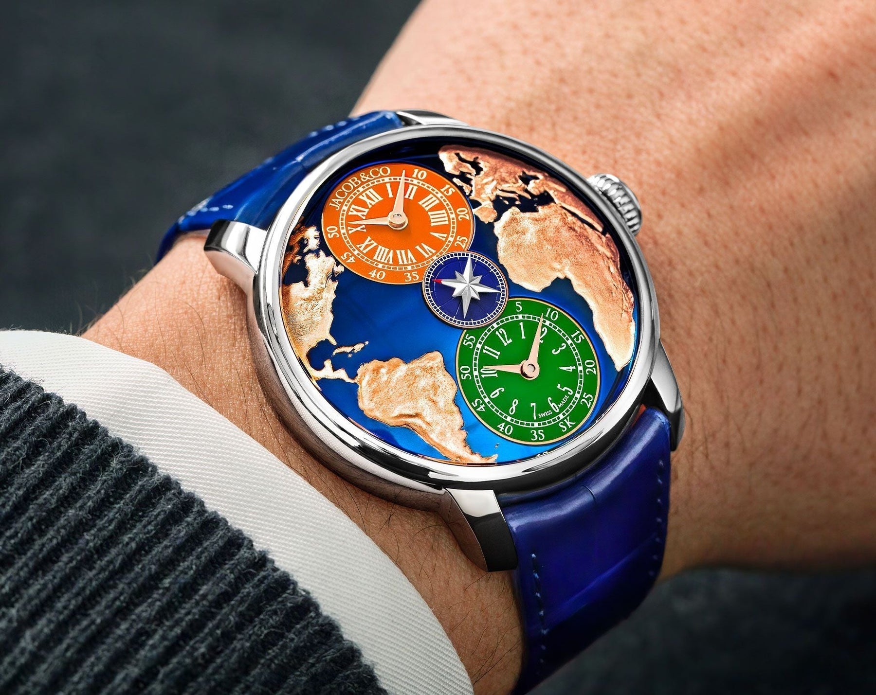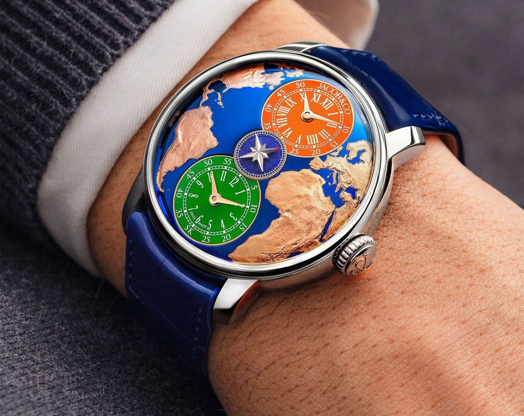 The Jacob & Co. Self-Winding JCAA14 is a finely engineered automatic movement, showcasing 206 meticulously assembled components and 33 jewels for optimal precision and durability. Operating at a frequency of 28,800 vibrations per hour (4 Hz), it delivers smooth and reliable performance. A standout feature of the JCAA14 is its double timezone function, allowing independent adjustment of both hours and minutes, a testament to Jacob & Co.’s commitment to functional complexity. Additionally, a central small seconds mechanism enhances timekeeping precision. With a 42-hour power reserve, this movement maintains stable operation, ensuring longevity and efficiency. The JCAA14 exemplifies Jacob & Co.’s expertise in crafting high-performance calibres, blending innovation with mechanical mastery.