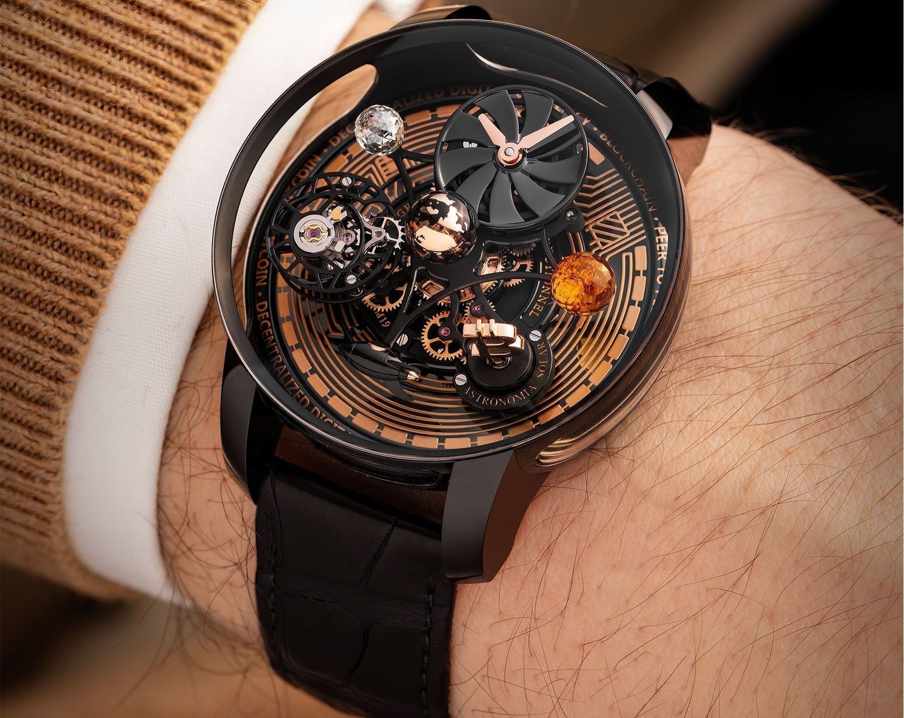 The Jacob & Co. Astronomia Solar is a horological masterpiece that pushes the boundaries of watchmaking artistry. This extraordinary timepiece features a massive 44mm case crafted from 18K rose gold and sapphire crystal, offering a captivating 360-degree view of its celestial-inspired mechanism. At the heart of this cosmic marvel is the JCAM19 manual-winding movement, boasting an impressive 48-hour power reserve. The dial showcases a mesmerising celestial dance with a rotating three-arm carousel. One arm carries a Jacob-cut diamond representing the sun, another holds a hand-painted magnesium globe of the Earth, and the third supports the differential-driven time display. The Astronomia Solar's complexity is further enhanced by a aventurine base adorned with gem-set planets, adding depth and sparkle to the celestial tableau. The rotating double-axis tourbillon, completing a revolution every 60 seconds, demonstrates Jacob & Co.'s technical prowess. Water-resistant to 30 metres, this timepiece is secured by an alligator leather strap with an 18K rose gold folding clasp. The Astronomia Solar is not just a watch, but a wearable piece of cosmic art, perfect for collectors and connoisseurs who appreciate the pinnacle of horological innovation and artistic expression.