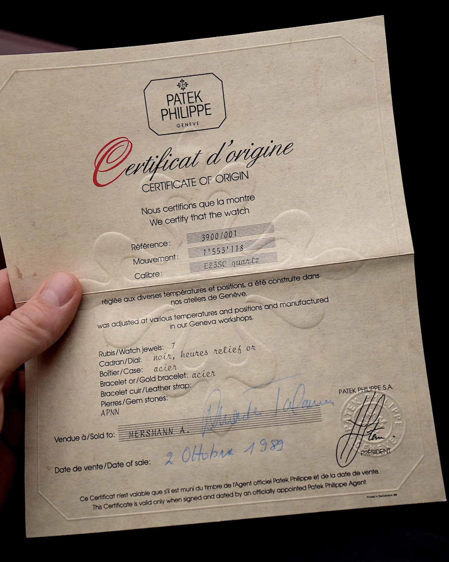 • comes with original Patek Philippe certificate from first purchase 2nd October 1989 in Lugano Switzerland